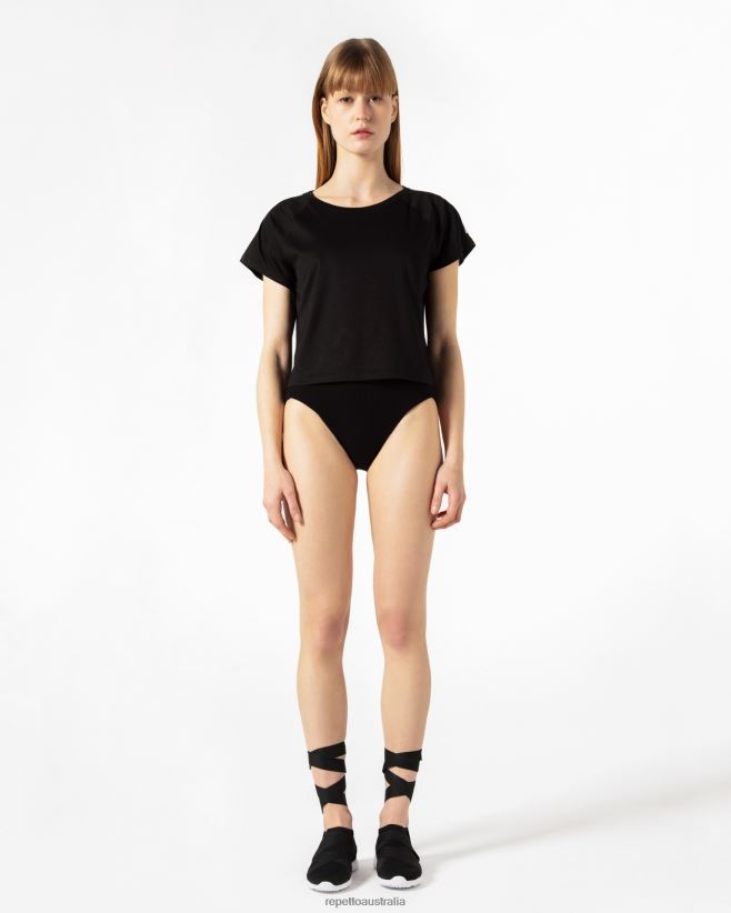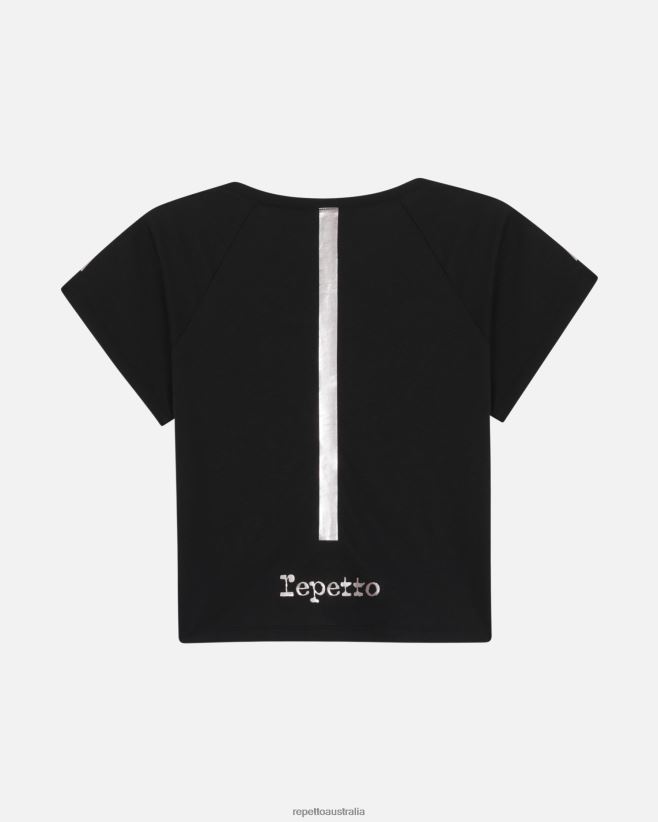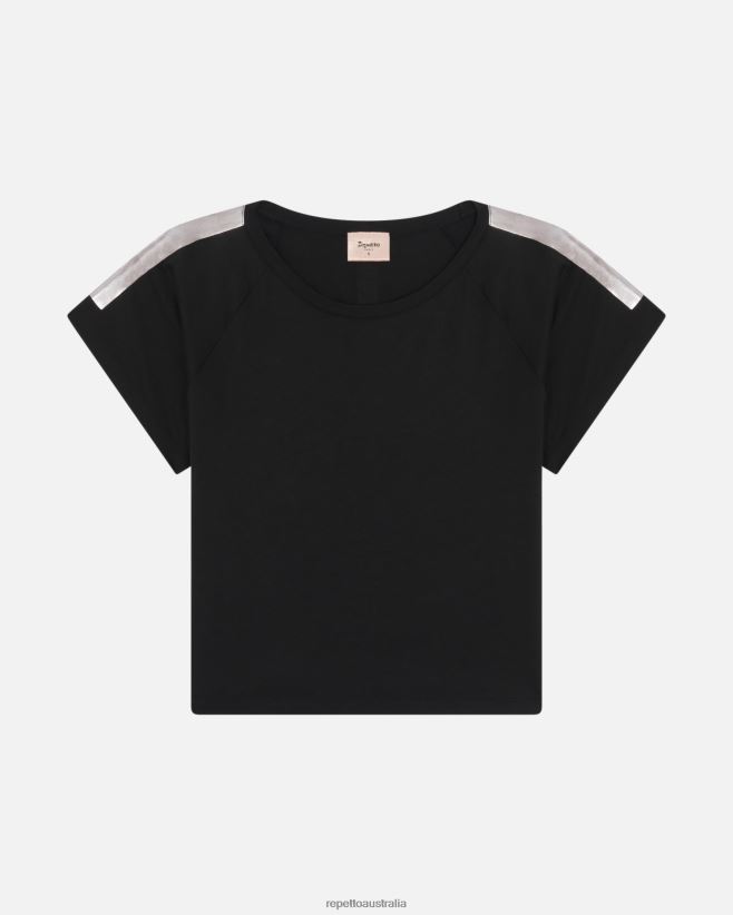 Details: Short sleeve raglan top. Round neckline. Square shape. Pearl effect band and Repetto logo.