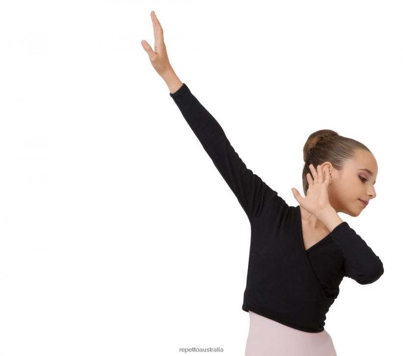 Wrap-over top with long sleeves for young dancer. Ideal for warming-up. Warming-up is an essential step for all dancers, regardless of their level in dance, our warm-up items are comfortable and offer excellent thermal protection. Drawstrings to knot on side, V-neck.