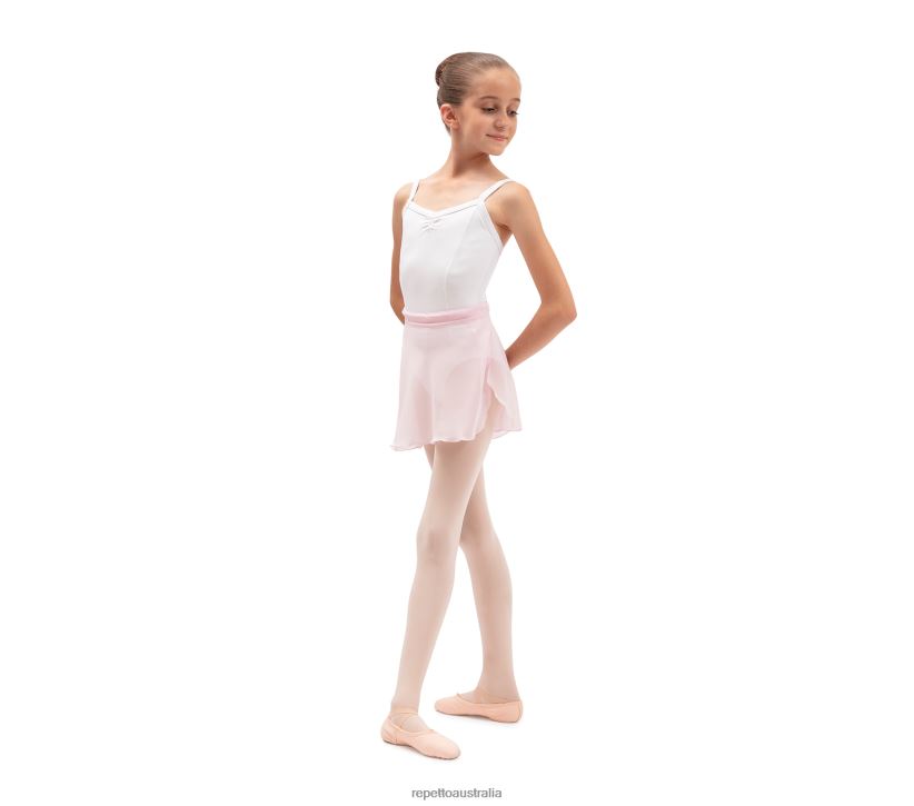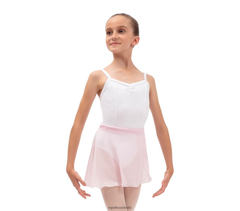 The girls skirt is a part of the dancer's outfit. Placed on the leotard, it can be worn crossed or knotted edge to edge on the side with the drawstrings. The semi opaque chiffon gives a glimpse of the hips positioning, and lets see the work of the legs. Colours coordinated with Repetto leotards. Transparent transfer of the Repetto logo on the front.