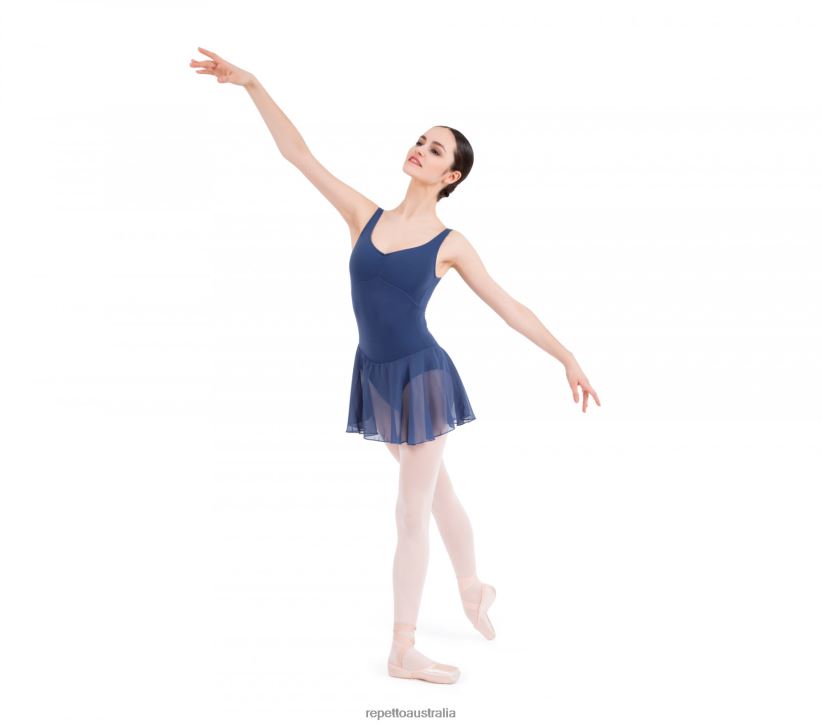 : Thin straps. Gathered in the front and the back. Yokes under breast. Chiffon frill. Transparent transfer of the Repetto logo.